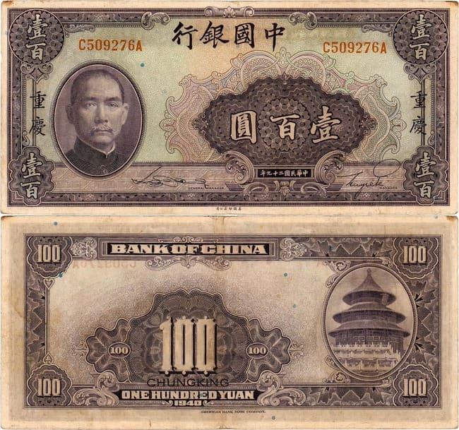 Серия C 509276A (красная). Типография AMERICAN BANK NOTE COMPANY. Оборотная сторона-Храм Неба. KM 88b. XF.