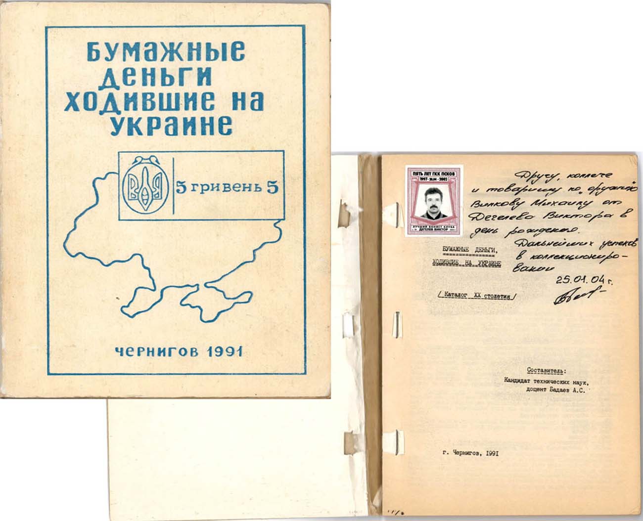 Чернигов. 1991 г. Подробный каталог, с указанием большого количества наименований как общегосударственных бумажных денег России, РСФСР и СССР, обращавшихся на территории Украины, так и многочисленные частные и военные выпуски. Особенно полезна для коллекционеров будет указанная автором степень редкости для каждого выпуска.