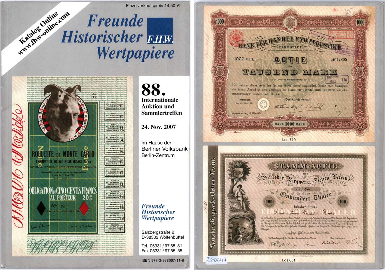 Вольфенбюттель, 24 ноября 2007 года. Около 1450 лотов ценных бумаг всего мира. В первую очередь США и Европа. Более 45 интересных русских лотов. Каждый лот с подробным описанием и исторической справкой.