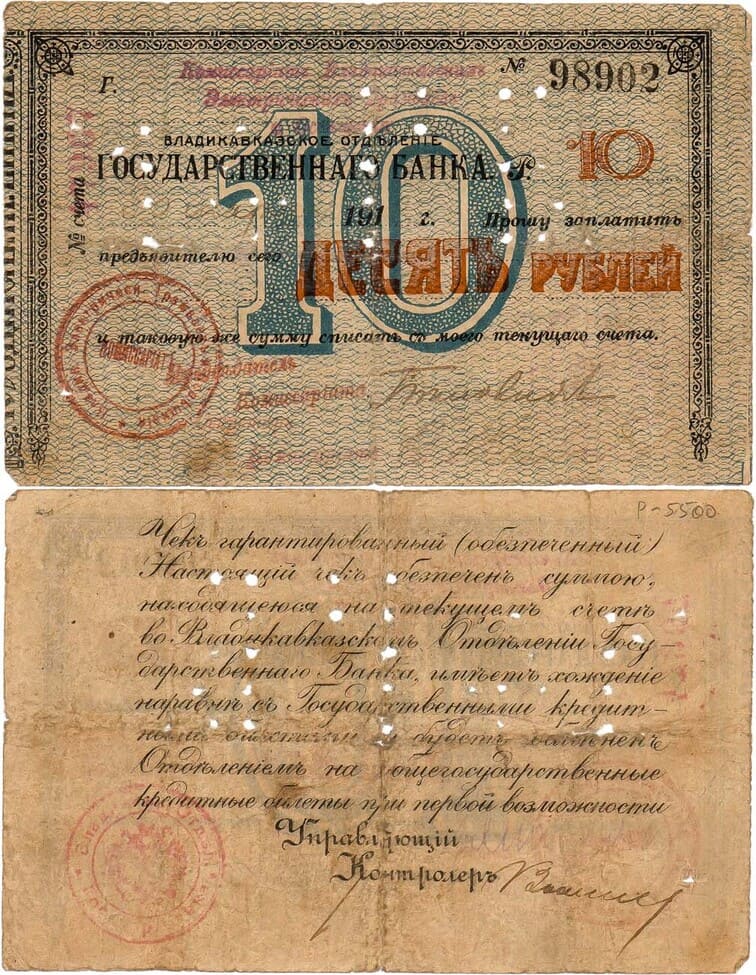 №98902. С перфорацией "14 ГБ". Без текста, рукописная подпись. "Комиссариат Владикавказского Электрического ...". Рябченко 4080 (5 д.). F/VF.