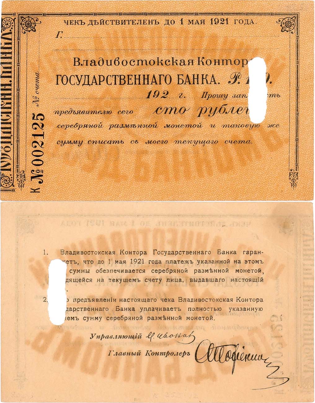 Серия К №002125. Не заполнен. Бланк. Чек действителен до 1 мая 1921 года. Без корешка. Рябченко 5965р (14д). XF.