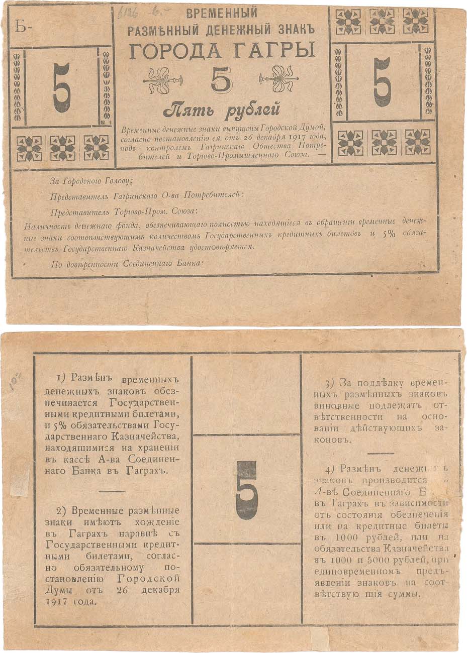 Гагры. Городская Дума. Временный разменный денежный знак 5 рублей 1918 года. Бланк..