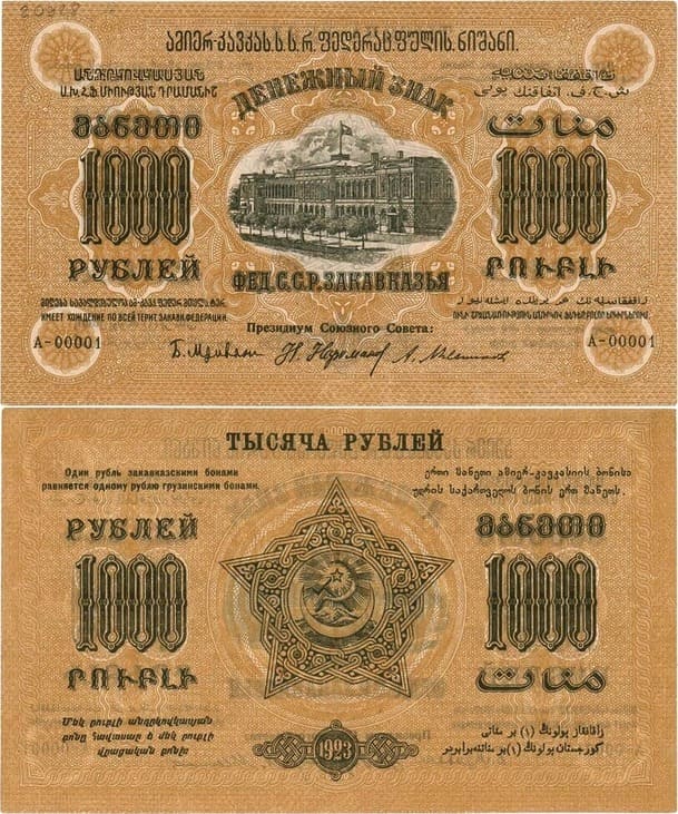 Серия А-00001. Водяной знак - теневые звезды. Завитки рамки на реверсе в одну сторону. Кардаков VIII.8.1. Жуков/Малышев 49.1. UNC-.
