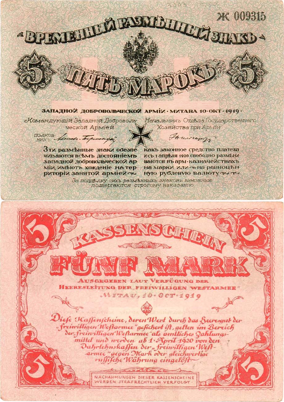 Полковник П.Р. Авалов-Бермондт. Серия Ж 009315. Кардаков IV.1.6 (1,25 дойчмарки). Выпуск с конгревом (выдавленный круглый штемпель). Ro MIL2a (LE-64/S227) AU.