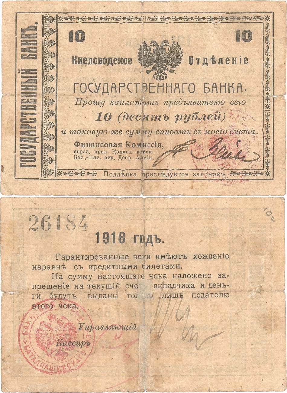 Баталпашинский выпуск, с печатью Баталпашинского казначейства на обороте, производился с октября по декабрь 1918 года и составляет основной объем выпущенных чеков. 20 января 1920 года Шкуро занял Кисловодск.