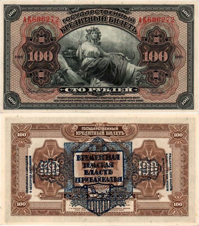 В казначействе Верхнеудинска хранились доставленные из Владивостока по указанию Министерства Финансов правительства Колчака изготовленные в США кредитные билеты 25 и 100 рублей образца 1918 года. Земская Управа, начиная с февраля 1920 года, выпустила в обращение эти билеты, нанеся на их оборотную сторону надпечатку. Билеты американского изготовления с надпечаткой Временной Земской Власти Прибайкалья. Грифование производилось Иркутской ЭЗГБ. На кредитных билетах был наложен гриф «Временная Земская Власть Прибайкалья» на билетах в 100 рублей — синей краской.