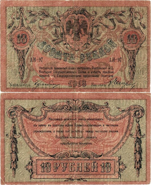 Серия АИ-97. Водяной знак - вензель ГБ. Выпуск Ростов-на-Дону, 1919 год. Рябченко 2966р (1д). Истомин E170.6.1d VF.
