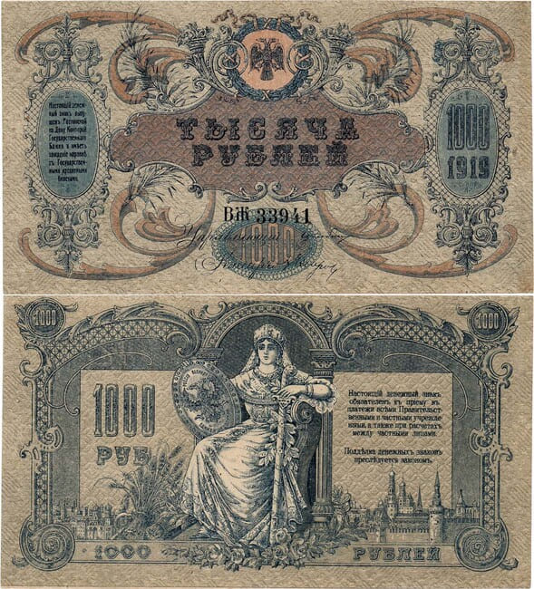 Серия ВЖ 33941. Номер пяти-значный. Водяной знак "ГБ". Новороссийск. Выпуск январь 1920 года. E170.12.1b1. Рябченко 2996р (1д) AU.