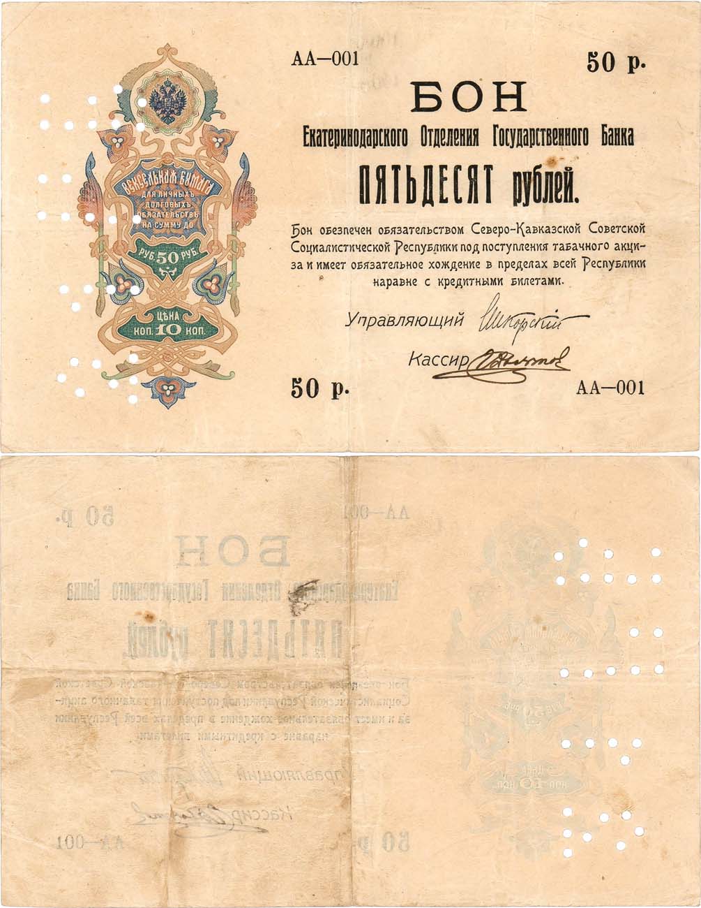 50р. - Бон обеспечен обязательством Северо-Кавказской Советской Социалистической Республики под поступления табачного акциза и имеет обязательное хождение в пределах всей Республики наравне с кредитными билетами.