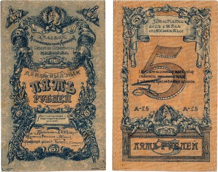 Серия А-15. Выпущена в Пятигорске в октябре 1918 года. После занятия Добровольческой армией Северного Кавказа белым командованием было объявлено, что денежные знаки, выпущенные Советской властью в купюрах 25-500 рублей не имеют обязательного обращения, а денежные знаки 5 и 10 рублей обязательны к приему в платежи. После освобождения Северного Кавказа от деникинцев сохранившиеся денежные знаки Северо-Кавказской ССР были обменяны на имевшие хождение денежные знаки РСФСР. Кардаков VII.7.6. Истомин Е215.8.1. XF.