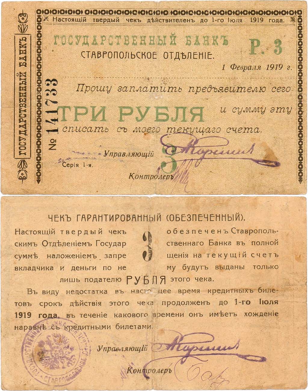 №141733. 1 февраля 1919 года. Гарантированный (обеспеченный) чек. С круглой синей печатью отделения банка и подписями. Срок действия 1 июля 1919 года. Рябченко 3644 (10 д.). VF/XF.