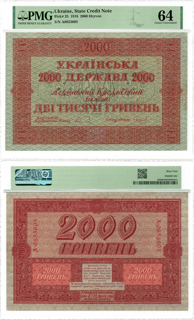 Серия А № 0853605. Украинское Государство (гетман Скоропадский). Кардаков V.1.24. Рябченко 37 (15д). Pick 25. 64 Choice Uncirculated.
