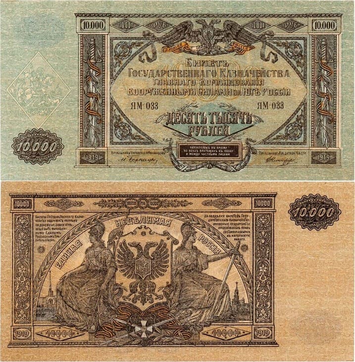 Серия ЯМ-033. Выпуск Феодосия, 1920 год. Водяной знак - мозаика. Более темный тон аверса и реверса. Кардаков №VI.3.20. AU.