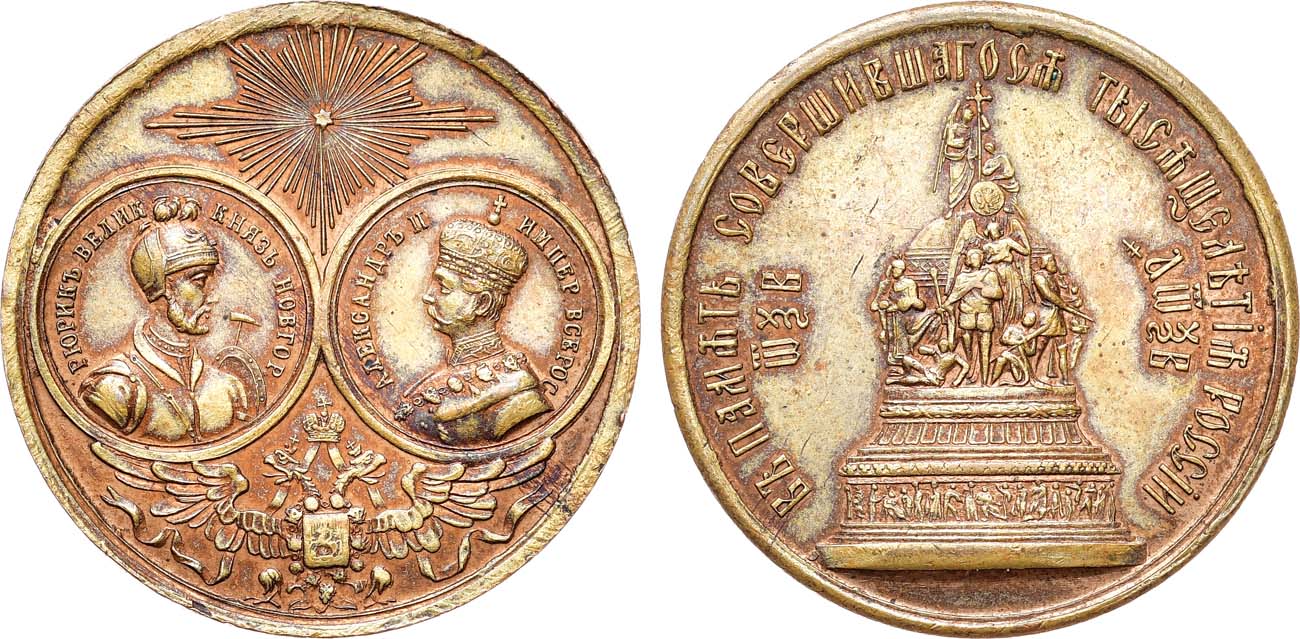 "Тысячелетие России" - монумент, воздвигнутый в Новгороде в 1862 году в честь тысячелетнего юбилея летописного призвания варягов, с которым традиционно связывается начало русской государственности, представляет собой гигантский шар-державу на колоколообразном постаменте, вокруг державы установлены шесть скульптурных групп. Общая высота памятника - 15,7 м. Авторы проекта памятника - скульпторы Михаил Микешин, Иван Шредер и архитектор Виктор Гартман. Памятник находится в новгородском детинце, напротив Софийского собора и бывшего здания Присутственных мест.