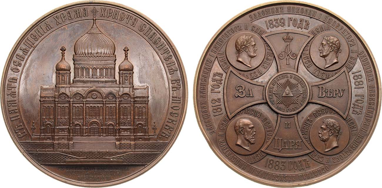 Бронза. 228,11г. Диаметр 77,5 мм. Санкт-Петербургский монетный двор. Медальеры В.В. Алексеев (на аверсе в обрезе изображения императора Александра III "В.А."), А.Г. Грилихес-отец (без подписи). Смирнов 875. Дьяков 936.1(R0). AU/UNC.