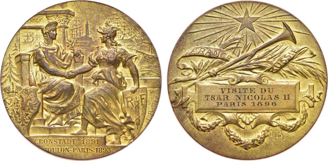 Бронза, золочение. 54,11г. Диаметр 50 мм. Парижский монетный двор (на гурте клейма "рог изобилия; BRONZE"). Медальер Луи Александр Ботэ (на аверсе на 4 часа "L.Bottee."; на реверсе на 5 часов "LB"). Гравировка на реверсе в картуше в 3 строки "VISITE DU / TSAR NICOLAS II / PARIS 1896" - Визит императора Николая II, Париж 1896 год. AU/UNC.
