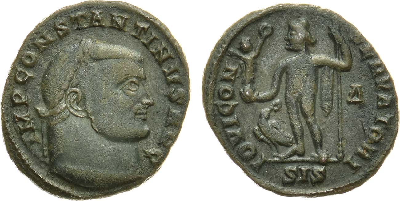 Биллон. 3,34г. Сисция. Аверс: профиль императора Константина; круговая легенда "IMP CONSTANTINVS AVG". Реверс: стоящий, обращённый влево Юпитер, опирающийся на скипетр и держащий в правой руке фигуру богини Виктории с венком в руке на державе. У ног Юпитера орёл вправо с венком. Знак монетного двора "SIS". Знак оффицины (отделение монетного двора) "Δ" (=4) на поле. Круговая легенда "IOVI CONSERVATORI" ("Юпитеру-хранителю"). Sear 15940. AU.