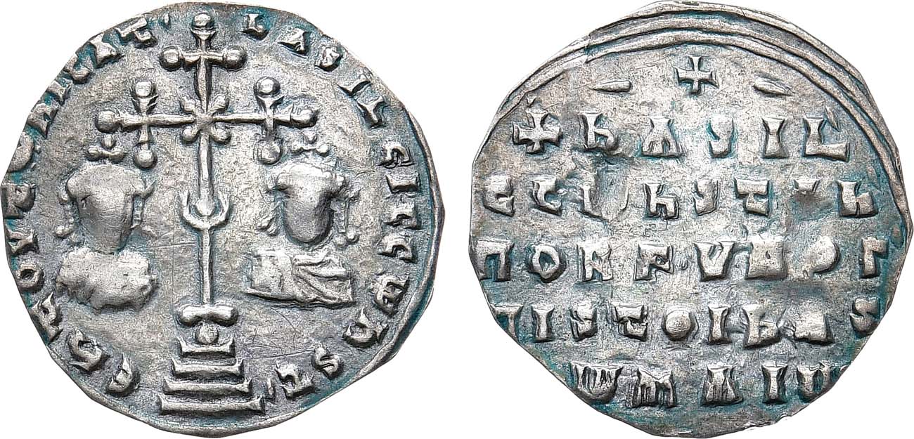Серебро. 1,68г. Константинополь. Аверс: большой крест на четырехступенчатом алтаре и державе, по сторонам бюсты Василия и Константина; легенда "ЄҺ TOVTω ҺICAT' baSILЄI C CωҺST". Реверс: легенда "+bASIL´ / C CωҺSTAҺ´ / ΠOR FЧROS´ / ΠISTЧ bAS´ / RωmAIω´". VF.