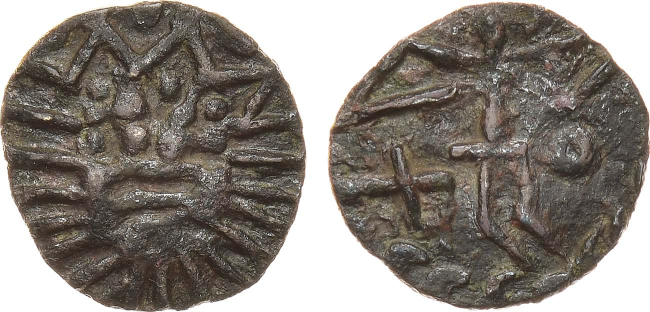 Серебро. 1,29г. Аверс: грубое схематичное изображение головы вправо. Реверс: фигура воина с копьем, слева в поле "X", справа - "O". Клещинов 468. XF.