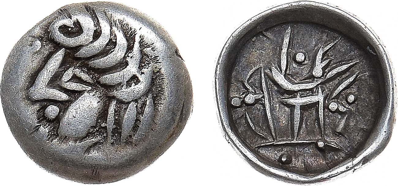 Серебро. 0,4г. Аверс: схематичная голова правителя влево. Реверс: схематичное изображение воина с луком вправо. VF.