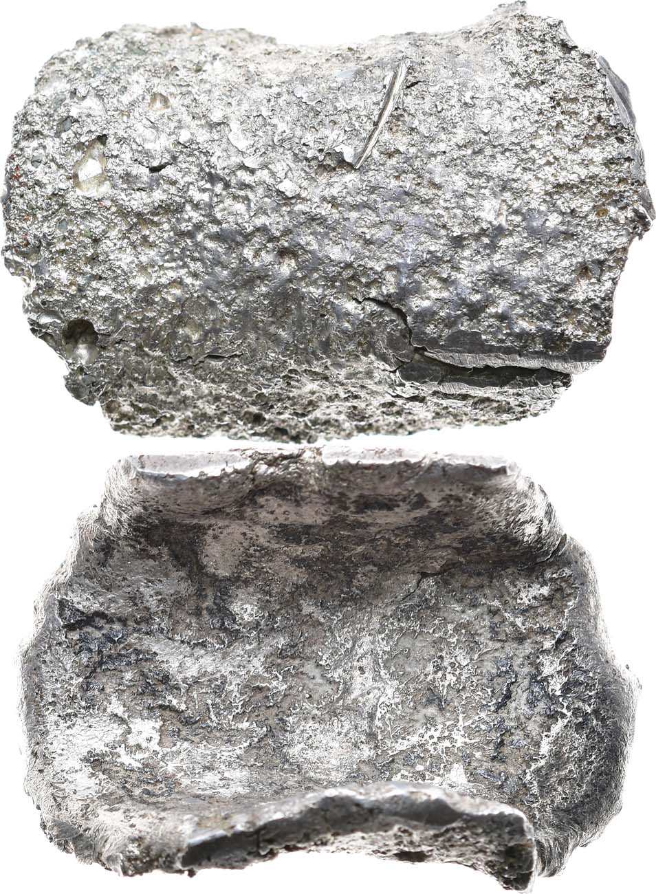 Серебро. 43,06г. Размер 52,28х42,32 мм. Высота: 42,32 мм. Длина: 28,70 мм. Ширина: 16,65 мм. Толщина: 3,21-4,12 мм. На небольших сегментах краёв слитка видны следы проковки металла. Изготовлен в XI-XII вв. Прокопов 14. AU.