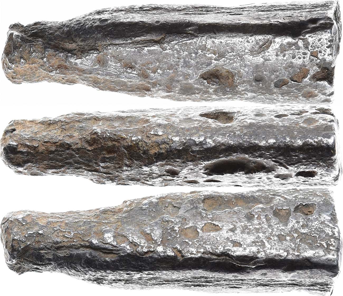 Серебро. 92,84г. Длина 61,33 мм. Ширина 15,10 мм (середина), 9,94 мм (край). Высота 10,95 мм (край), 19,20 мм (середина). Отсутствие у слитка шва на боковой поверхности свидетельствует о его литье в один приём. Изготовлена в первой половине XIV века. AU.