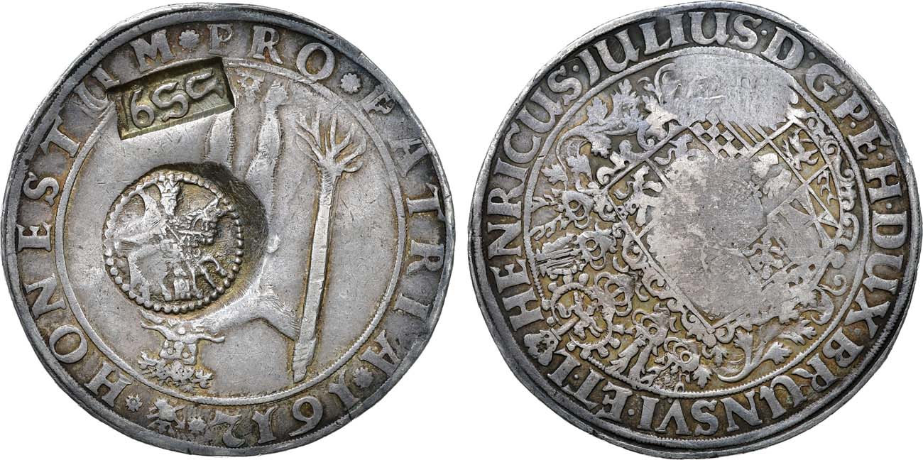 Серебро. 28,84г. Целлерфельд. Круглое клеймо с широкой закраиной "полумесяцем". На талере 1612 года герцогства Брауншвейг-Вольфенбюттель. Спасский 741. Davenport 6285. AU.