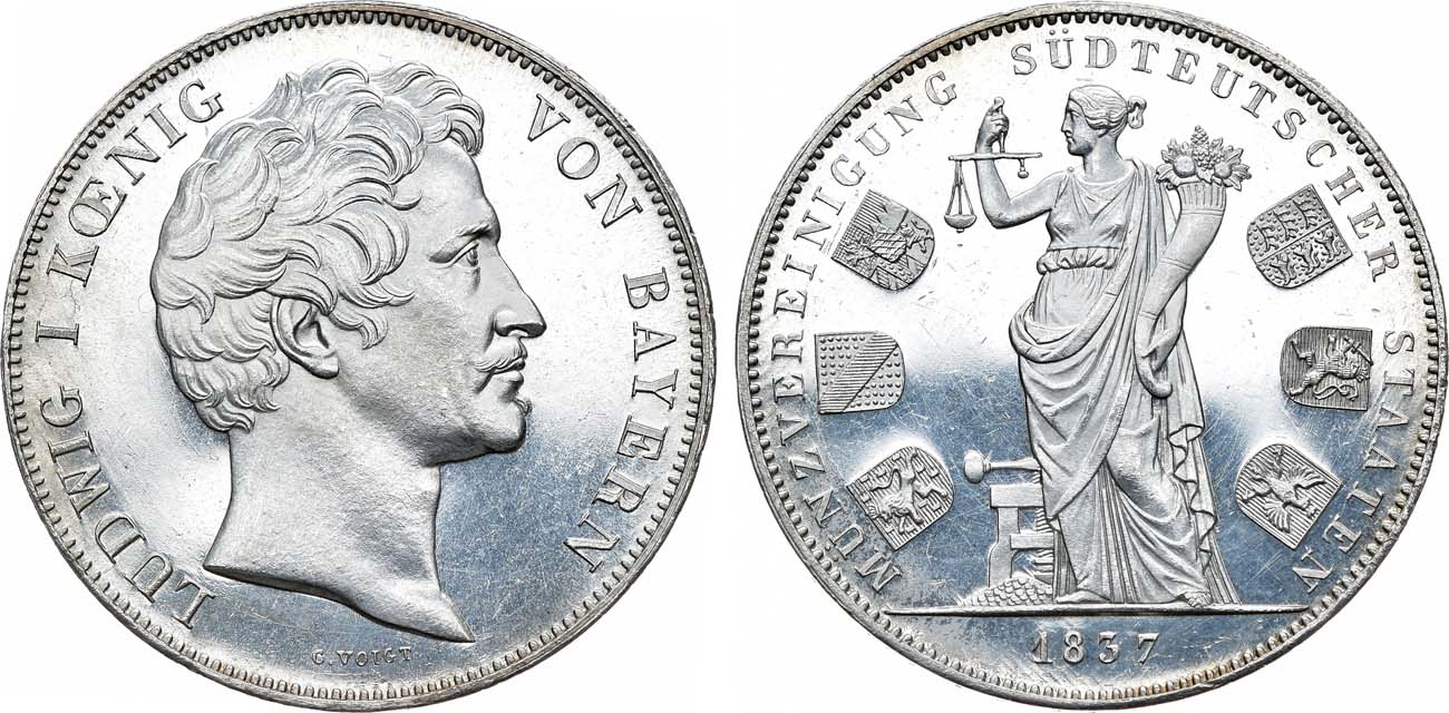 Серебро. 37,18г. Мюнхен. Отчеканена в честь денежного союза шести южно-германских государств. KM 792. AKS 98. Davenport 581. UNC PL.