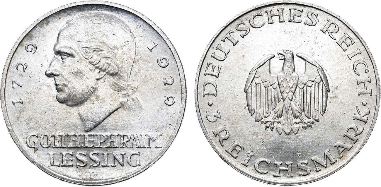Серебро 500 пробы. 15г. Мюнхен (D). 200 лет со дня рождения Готхольда Лессинга. KM 60. Jaeger 335. Weege 36.. UNC.
