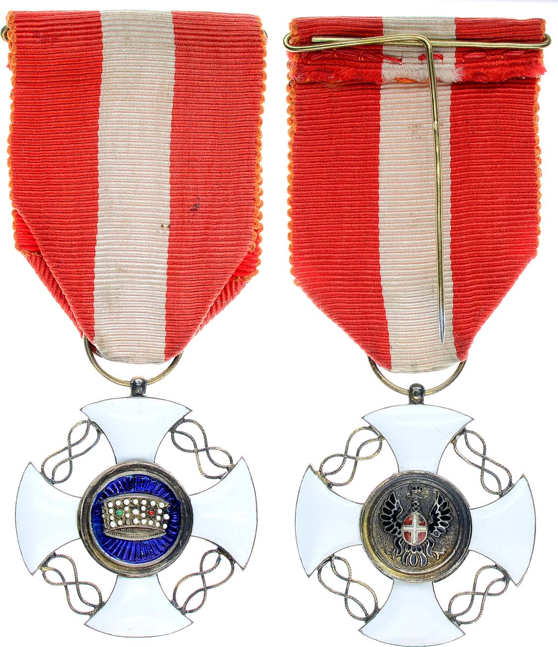 Знаки ордена состоят из креста белой эмали, плечи которого соединены золотыми савойскии узлами. В центре знака, находится круглый медальон с изображением Железной короны Ломбардских королей на синем фоне. С обратной стороны знака савойский орёл. Лента ордена красная с белой полосой.