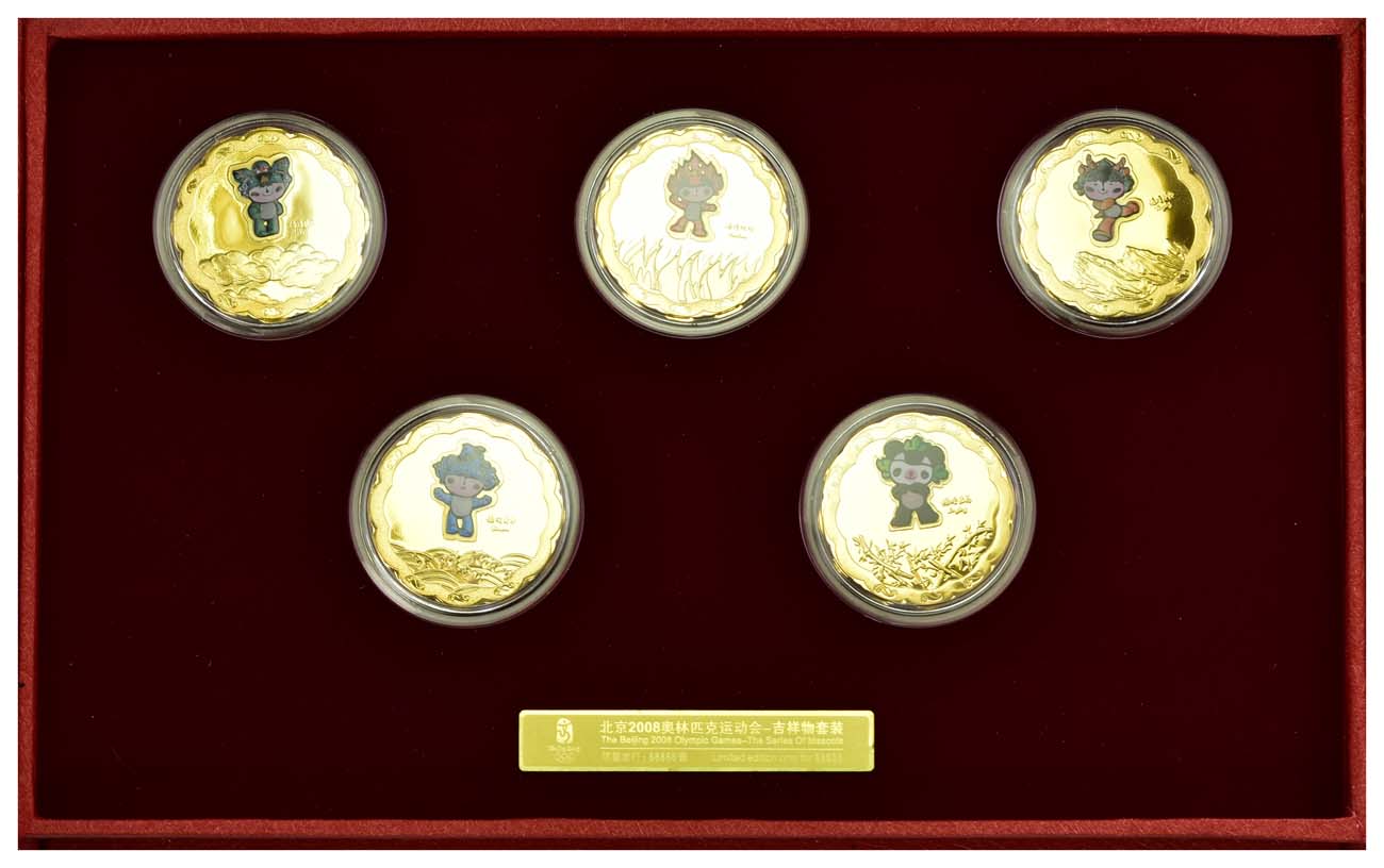 Латунь, золочение, эмаль. 25г. Медаль 2008 года. Диаметр 40 мм. Латунь позолота. 25 гр. Серия талисманы Пекинской олимпиады 2008 года. Бэй-Бэй — рыба голубого цвета, её пожелание — процветание. PROOF. Медаль 2008 года. Диаметр 40 мм. Латунь позолота. 25 гр. Серия талисманы Пекинской олимпиады 2008 года. Цзин-Цзин — панда чёрного цвета, её пожелание — счастье. PROOF. Медаль 2008 года. Диаметр 40 мм. Латунь позолота. 25 гр. Серия талисманы Пекинской олимпиады 2008 года. Ин-Ин — тибетская антилопа жёлтого цвета, её пожелание — здоровье. PROOF. Медаль 2008 года. Диаметр 40 мм. Латунь позолота. 25 гр. Серия талисманы Пекинской олимпиады 2008 года. Ни-Ни — ласточка зелёного цвета, её пожелание — удача. PROOF. Медаль 2008 года. Диаметр 40 мм. Латунь позолота. 25 гр. Серия талисманы Пекинской олимпиады 2008 года. Хуань-Хуань — дитя огня, красного цвета, символизирует страсть к спорту, а также олимпийский огонь и олимпийский дух. PROOF. PROOF.