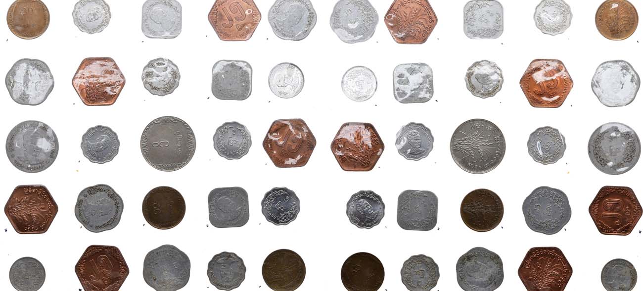 В составе лота: 1 пья 1996 (2 шт.), 5 пья 1966 (6 шт.), 10 пья 1966 (3 шт.), 10 пья 1983 (3 шт.), 25 пья 1966 (4 шт.), 25 пья 1986 (5 шт.), 50 пья 1966, 1 кьят 1975 (FAO). KM 38. 39. 40. 49. 41. 50. 42. 47. VF/UNC.