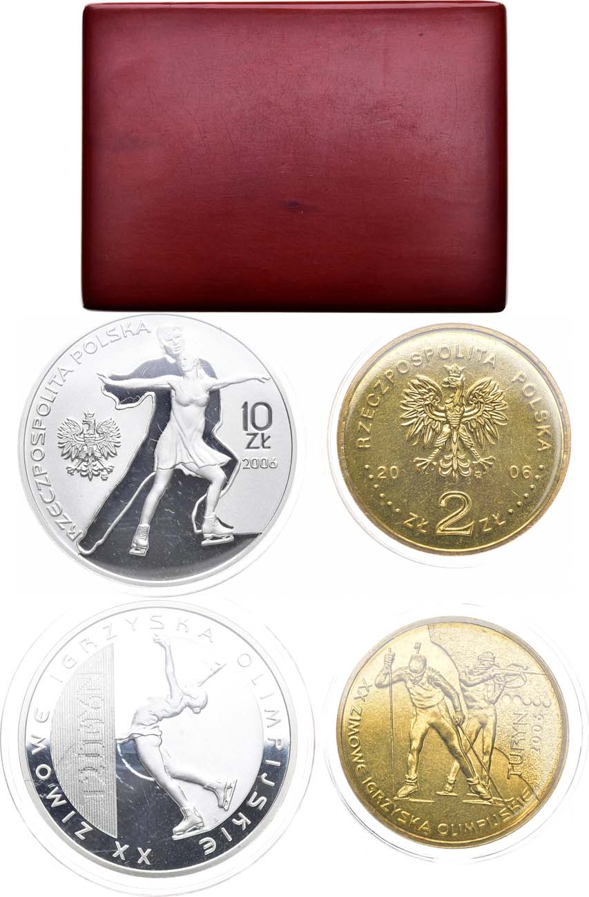 2 злотых 2006 года. Латунь. 8.15 г. Варшава (MW). Серия "Олимпийские игры в Турине". Биатлон. KM 605. AU/UNC. 10 злотых 2006 года. Серебро. 14,14 г. Варшава (MW). Серия "Олимпийские игры в Турине". Фигурное катание. KM 556. PROOF. UNC/PROOF.