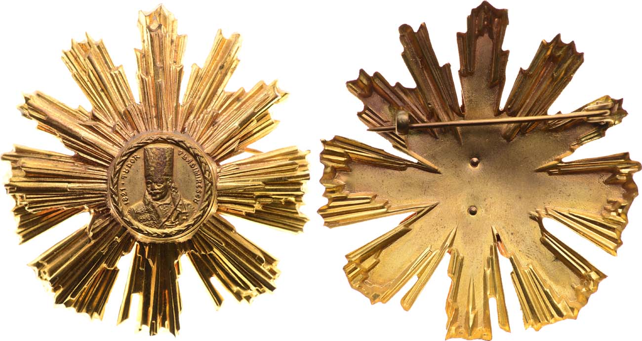 Бронза золочение. Размер 67х67 мм. Аверс: Золотая звезда, составленная из десяти пучков лучей разной длины; посредине круглый медальон с поясным изображением Тудора Владимиреску три четверти влево, вверху по окружности надпись: 1821 TUDOR VLADIMIRESKU. Реверс: Гладкая вогнутая с горизонтальной булавкой в верхней части. AU.