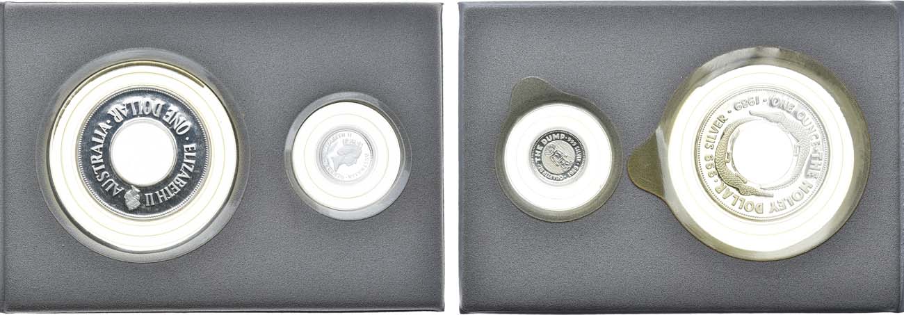Серебро. Австралия. 1 доллар 1989 года. Holey Dollar. 31,1 г. Тираж 45000 экз. Проба 999. КМ 131. PROOF. Австралия. 25 центов 1989 года. The Dump. 7,77 г. Тираж 45000 экз. Проба 999. KM 132. PROOF. KM 131. KM 132..