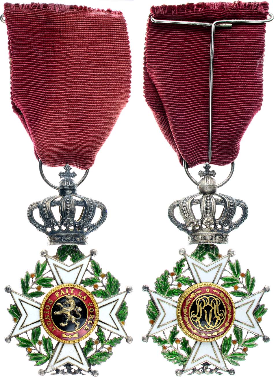 Серебро, эмаль. Размер 67х40 мм. Данным знаком Ордена 5 степени награждались гражданские лица (так называемый гражданский отдел Ордена) за высокие заслуги перед королем и Бельгийским Государством. Возраст претендента к награждению не должен был быть младше 42 лет. На красной муаровой ленте. XF.