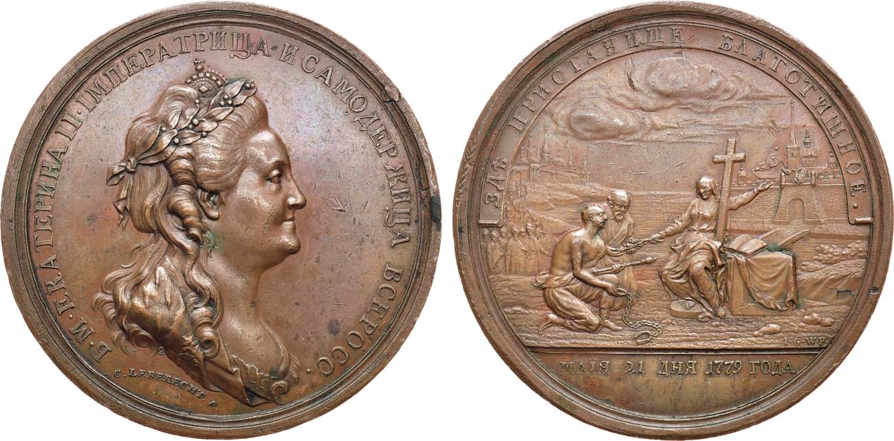 Бронза. 95,6г. Диаметр 65 мм. Санкт-Петербургский монетный двор. Аверс: медальер К. Леберехт (под портретом: "C•LEBERECHT•F•"). Реверс: медальер И.Г. Вехтер (справа над обрезом: "I•G•W•F•"). Смирнов 285. Рейхель 2618. Дьяков 178.1(R1). AU.