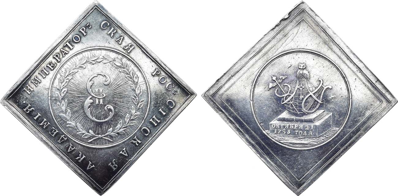 Четырехугольный в виде ромба академический жетон раздавался на заседаниях присутствовавшим членам Императорской Российской Академии. Императрица Екатерина II особым указом от 2 ноября 1783 г. повелела «делать на монетном дворе ежегодно по 1000 жетонов серебряных, ценою каждый в 80 копеек» для раздачи членам академии за сеансы.