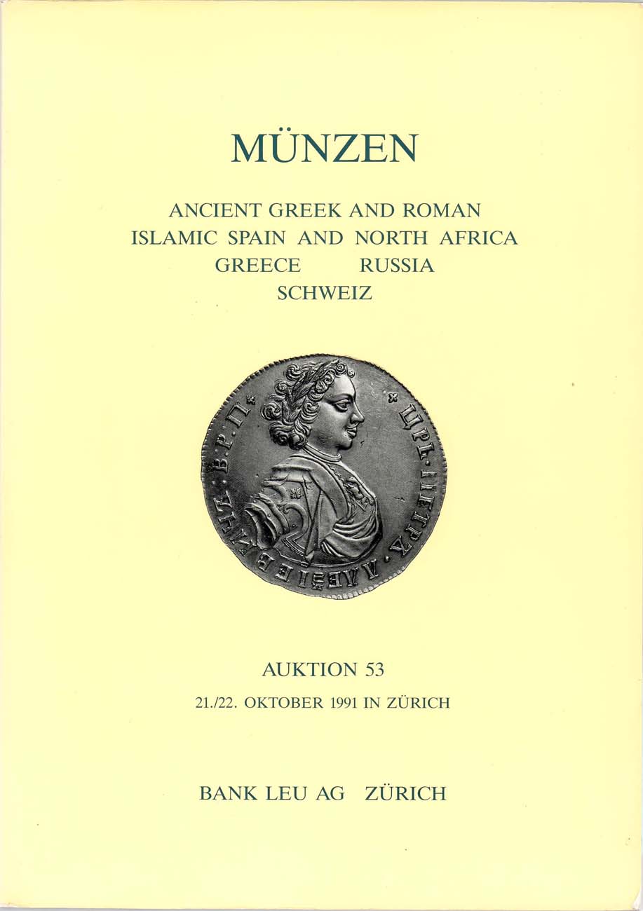 Цюрих, 21-22 октября 1991 года. 101 стр.+LIII табл. илл., 980 лотов. Античные монеты, исламские, Испания и Северная Африка, Греция, Россия, Швейцария. Более 150 лотов из коллекции русских монет. Распродажа большой коллекции русских монет в необыкновенно высокой коллекционной сохранности, предположительно из коллекции знаменитого американского нумизмата Вирджила Бранда, но официально аукционом это не подтверждалось. Следует особо отметить пробные рубли начала XIX века, знаменитый "Рейхелевский" рубль 1827 года, серию пробных монет Александра I, "Семейный рубль" 1835 и 1836 гг. с подписью "Р.П. Уткин" и с подписью "П.У.", крайне редкий "Рейхелевский" пробный рубль 1845 года с портретом Николая I и многое другое. Монеты XIX и начала XX вв. практически все в исполнении proof.