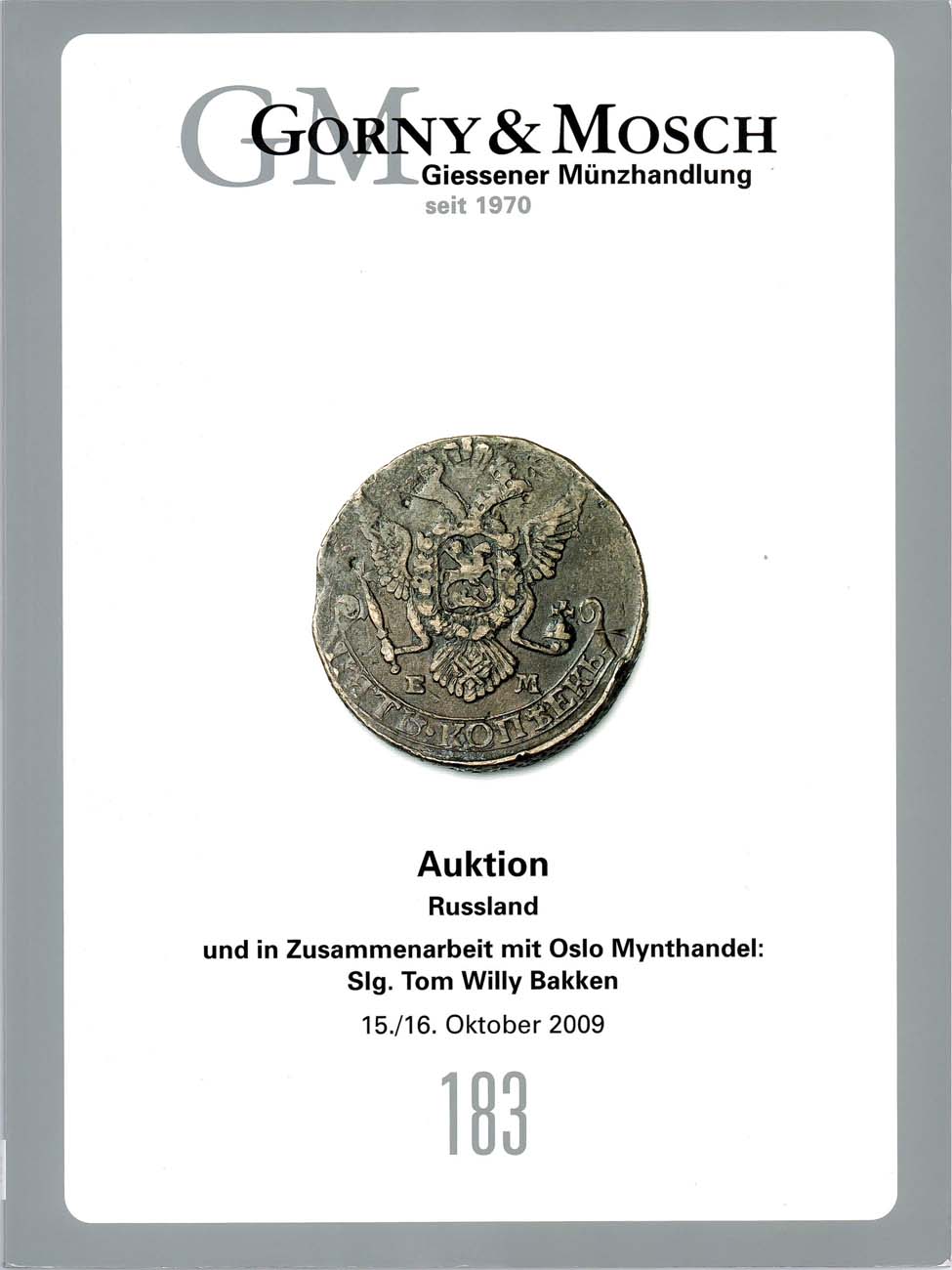 Мюнхен, 15-16 октября 2009 года. 97 стр. 1706 лотов. Более 700 лотов русских медных монет и медалей из известнейшей коллекции норвежского нумизмата Тома Вилли Баккена, "ученика" другого норвежца Бернарда Брекке, в сотрудничестве с которым и было написано дополнение к каталогу медных монет Брекке 1977 года.