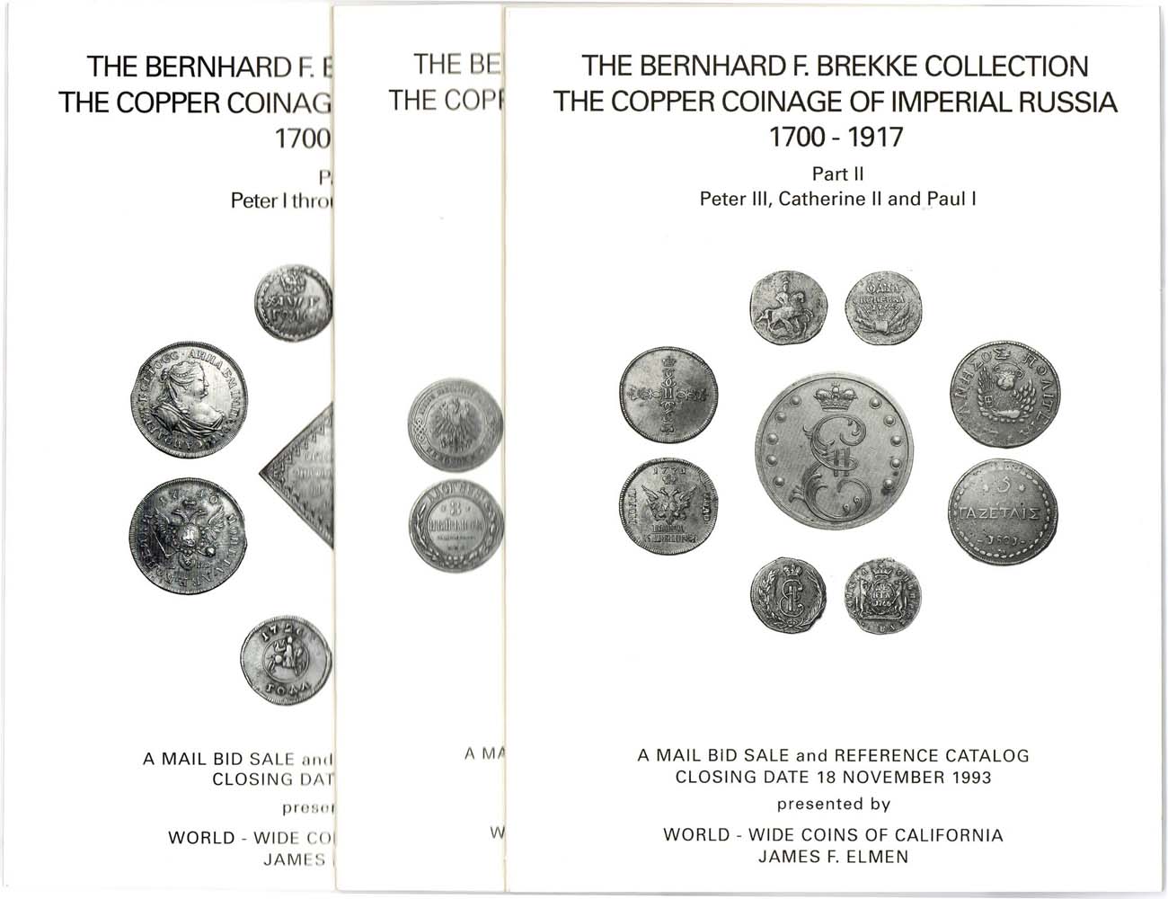16+20+28 стр., 24+39+28 стр. илл. Санта-Роза, 1993-1994гг. 900 лотов из непревзойденной коллекции русских медных монет Бернхарда Брекке. В трех частях - нумизматический аукцион, большое количество иллюстраций. На 91 таблицах изображены шедевры русской медной нумизматики, чрезвычайно редкие и уникальные монеты, а также пробники.