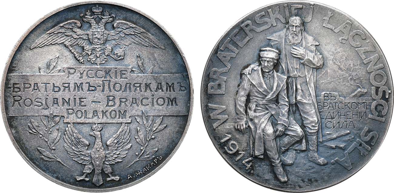 Серебро. Из серии медалей Российского Общества нумизматов, в память Первой мировой войны1914-1918 гг. Диаметр 33 мм. Петроград. Мастерская (ателье) А.Ф. Жакара (аверс — внизу слева у окружности: "А.ЖАКАРЪ"). Медальер Г.И. Малышев (без подписи). Дьяков 1582.1(R1).