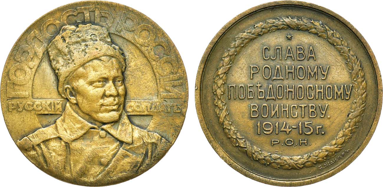 Бронза. 14,59г. Диаметр 33 мм. Из серии медалей Российского Общества нумизматов, в память Первой мировой войны 1914-1918 гг. Петроград. Мастерская (ателье) А.Ф. Жакара (на реверсе справа у окружности "А. ЖАКАРЪ"). Медальер Г. Малышев (без подписи). Дьяков 1585.1(R1). VF.