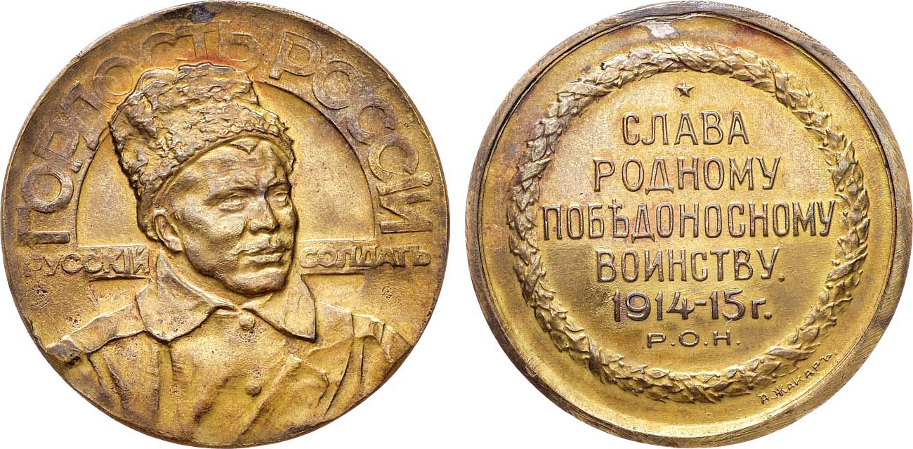 Бронза. 14,1г. Диаметр 33 мм. Из серии медалей Российского Общества нумизматов, в память Первой мировой войны 1914-1918 гг. Петроград. Мастерская (ателье) А.Ф. Жакара (на реверсе справа у окружности "А. ЖАКАРЪ"). Медальер Г. Малышев (без подписи). Дьяков 1585.1(R1). XF.