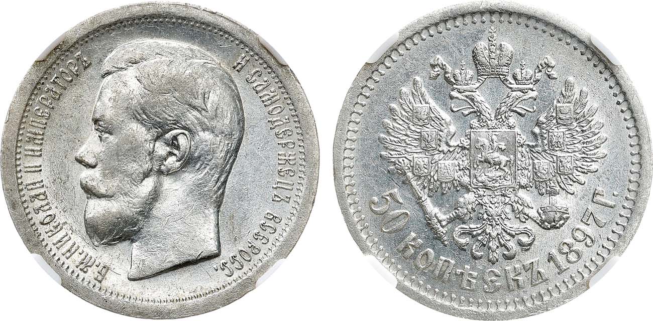 50 копеек раннего периода правления императора Николая II в высокой степени сохранности встречаются редко из-за их длительного обращения в обороте.
