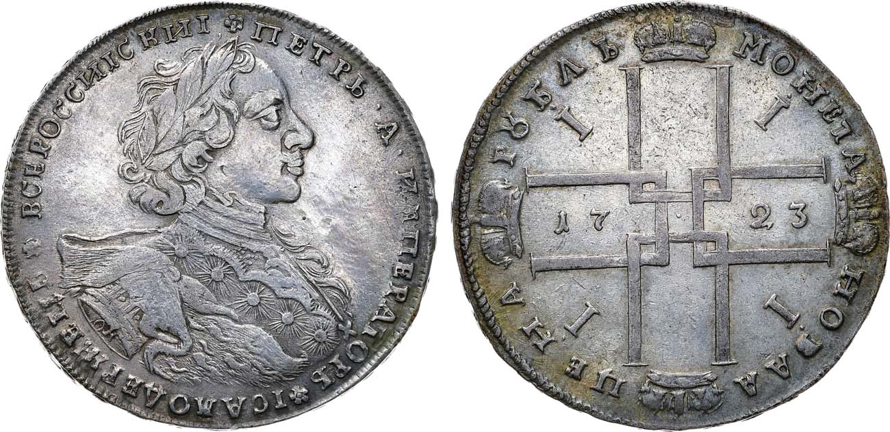Серебро. 27,54г. Красный монетный двор. Тип 1723 г. "Портрет в горностаевой мантии". Малый крест на груди императора. Аверс: розетка над головой, розетки и точки делят круговую надпись. Уздеников 0607. Биткин 860. 3 рубля 50 копеек по Петрову. Дьяков 264, 1309(R1). XF+.
