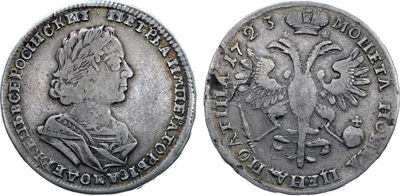 Серебро. 14г. Красный монетный двор. Портрет погрудный. Без инициалов медальера. Аверс: тип 1723 года - "круговая надпись сплошная", без полосок на рукаве. Реверс: малый крест на державе. Уздеников 0614. Биткин 1051(R1). 10 рублей по Петрову. Дьяков 279, 1397(R2). VF.