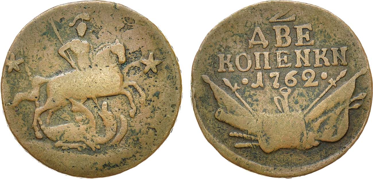 Медь. 9,39г. Без обозначения монетного двора. Реверс: дата "•1762•", номинал выделен точками, "КОПЕNКN". Гурт сетчатый. Уздеников 2629(•). Биткин 35(R). Дьяков 182, 38(R1). Brekke 105, 8. VF.