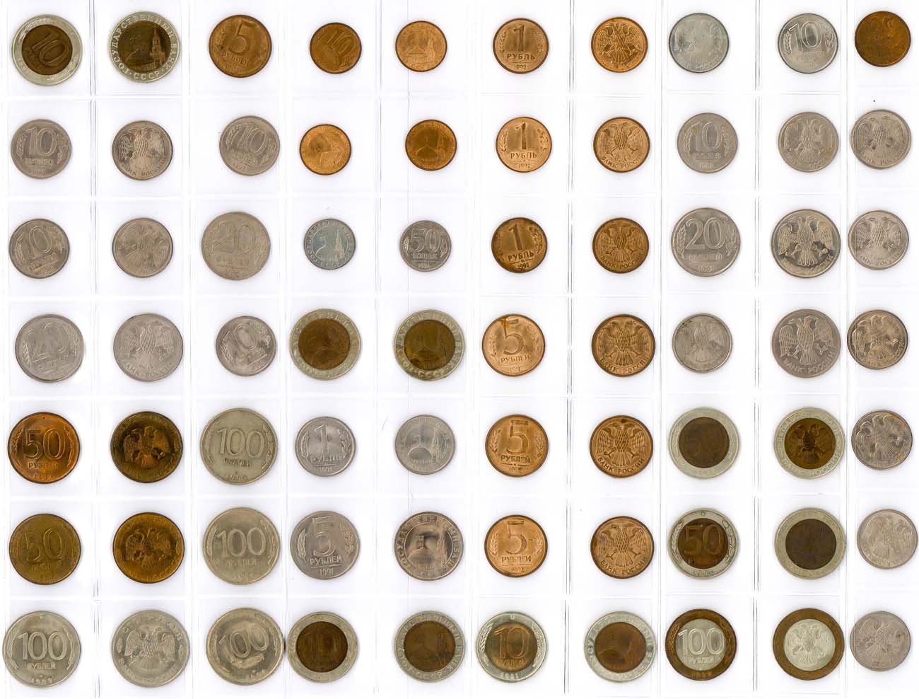100 рублей 1993 года (ЛМД) 5 шт., 100 рублей 1992 года (ЛМД) биметалл 2 шт. 50 рублей 1993 года (ЛМД) 2 шт., 50 рублей 1993 года (ММД) 2 шт., 50 рублей 1992 года (ЛМД) биметалл 4 шт. 20 рублей 1993 года (ММД) 2 шт. 20 рублей 1992 года (ММД) 2 шт., 20 рублей 1992 года (ЛМД) 2 шт. 10 рублей 1993 года (ЛМД) 6 шт. 10 рублей 1993 года (ММД) 4 шт. 10 рублей 1992 года (ЛМД) 4 шт. 10 рублей 1991 года (ЛМД) биметалл 6 шт. 5 рублей 1992 года (Л) 3 шт., 5 рублей 1992 года (М) 2 шт., 5 рублей 1992 года (ММД) 2 шт., 5 рублей 1991 года (ЛМД) 2 шт. 1 рубль 1992 года (Л) 3 шт., 1 рубль 1992 года (М) 2 шт., 1 рубль 1992 года (ММД) 2 шт., 1 рубль 1991 года (ЛМД) 2 шт. 50 копеек 1991 года (Л) 2 шт. 10 копеек 1991 года (М) 4 шт. XF/UNC.