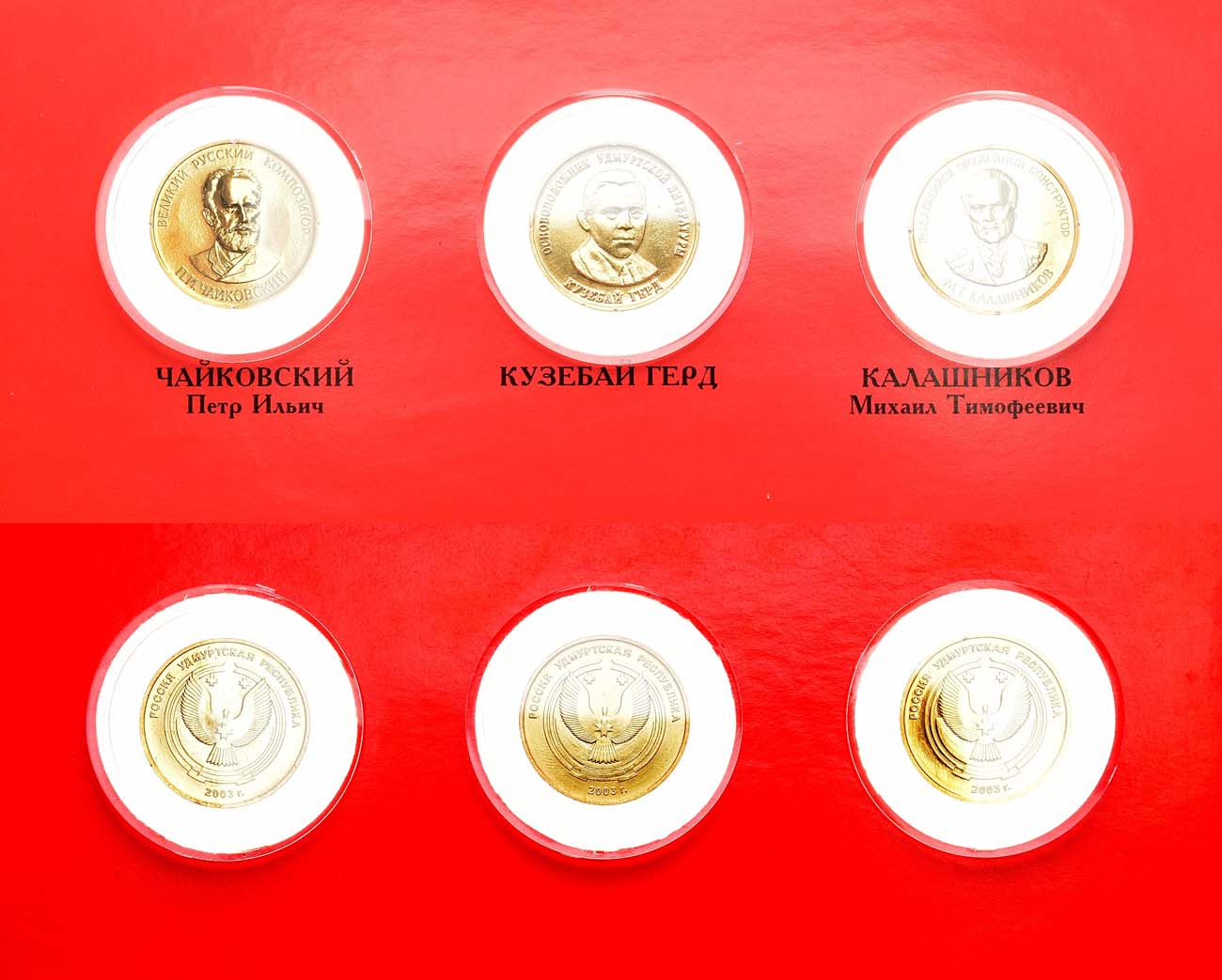 Медь. Диаметр 27 мм. Санкт-Петербургский монетный двор (без обозначения). Удмуртия, знаменитые люди- П.И. Чайковский. BU. Диаметр 27 мм. Санкт-Петербургский монетный двор (без обозначения). Удмуртия, знаменитые люди- Герд Кузебай. BU. Диаметр 27 мм. Санкт-Петербургский монетный двор (без обозначения). Удмуртия, знаменитые люди- Михаил Тимофеевич Калашников. BU. BU.